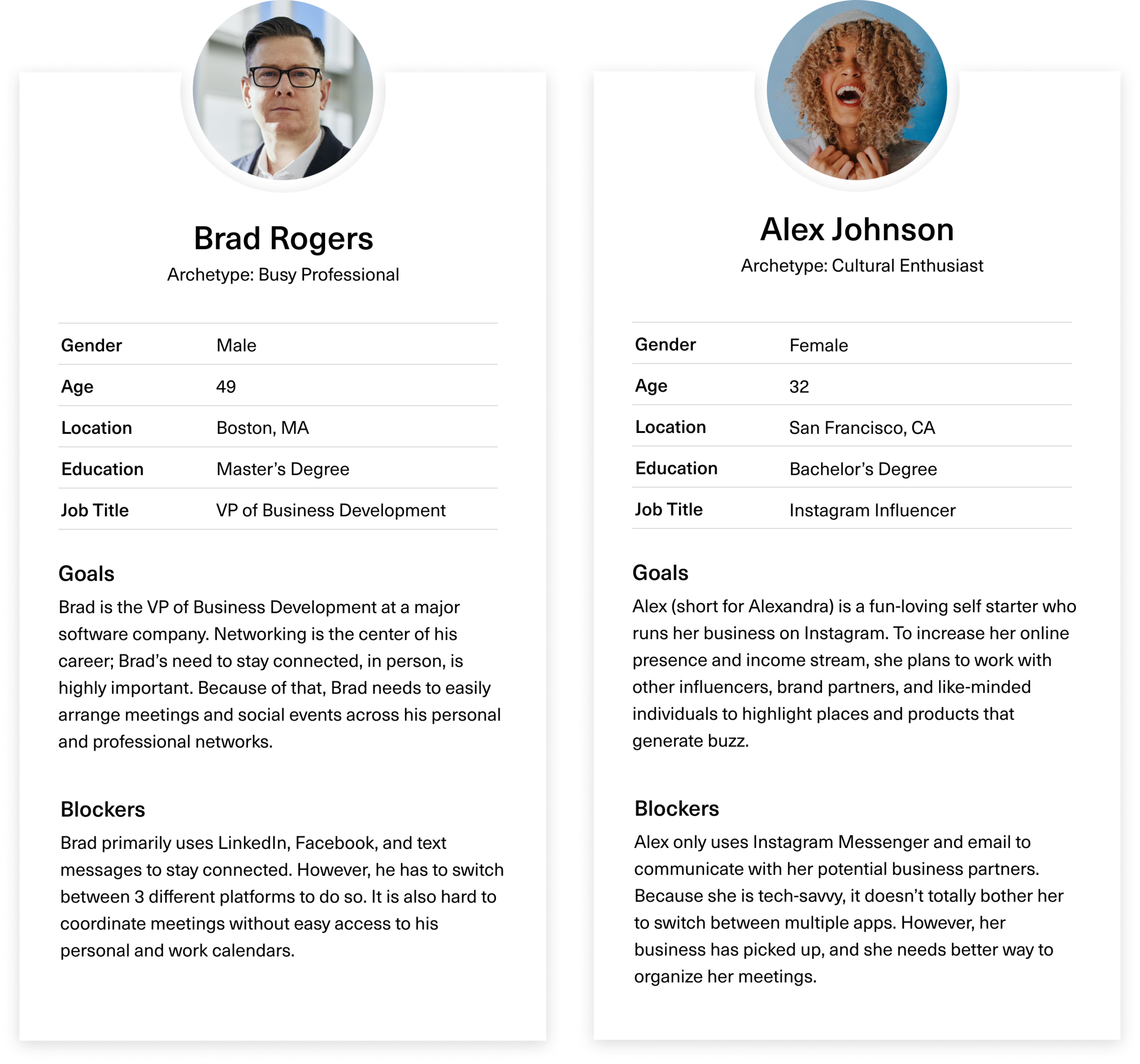 To test this concept, leadership split Elliot into 2 buckets: Elliot for “Busy Professionals”, and Elliot for “Cultural Enthusiasts”. These audiences are vastly different, but have similar needs. We developed user personas to begin the research phase, resulting in 2 different product variations.