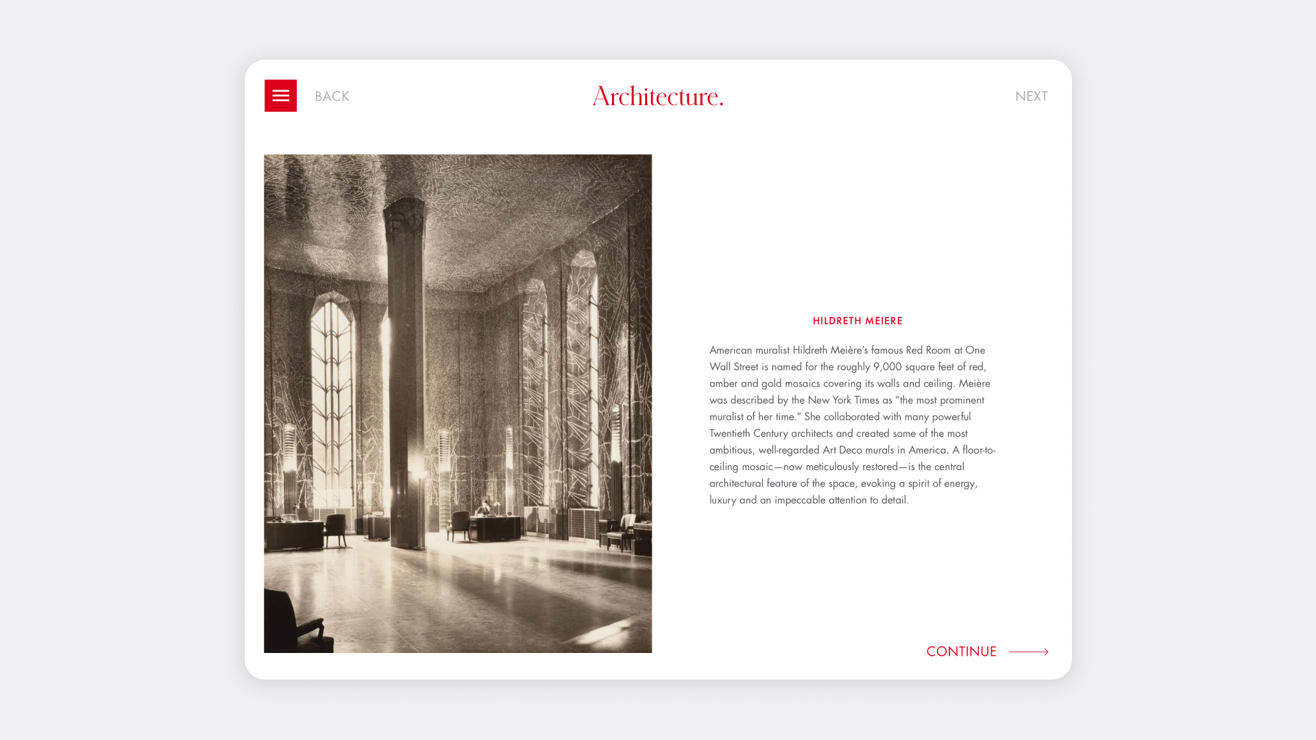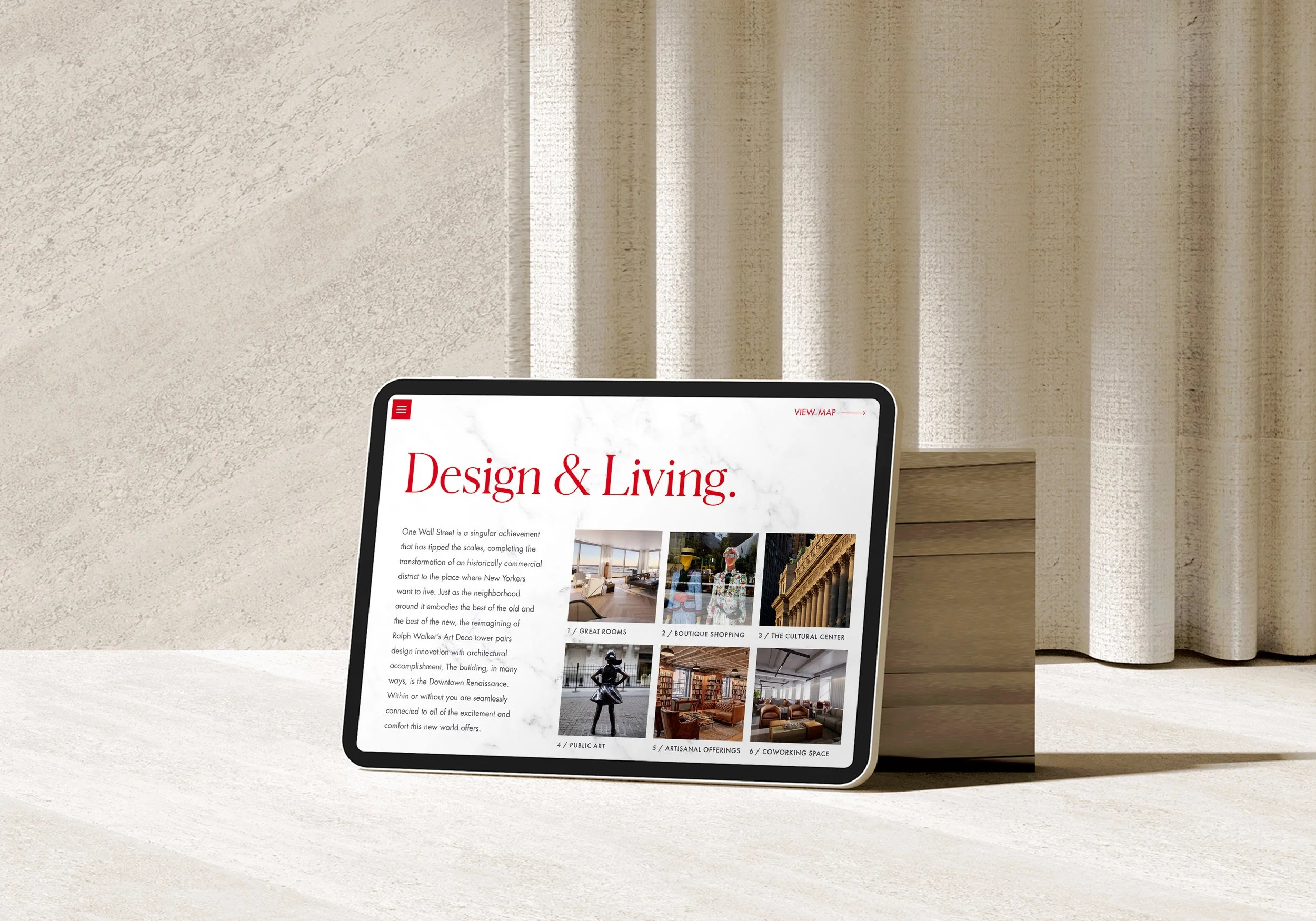 New York’s most iconic address, One Wall Street, has been undergoing renovations for decades to preserve its historic architecture, while modernizing its residential interiors. The developers sought to create a stunning, in-person 3D model and life-size digital presentation to sell the renovated homes. I created a seamless iPad app that streamed images directly into the 3D presentation room at One Wall Street.
